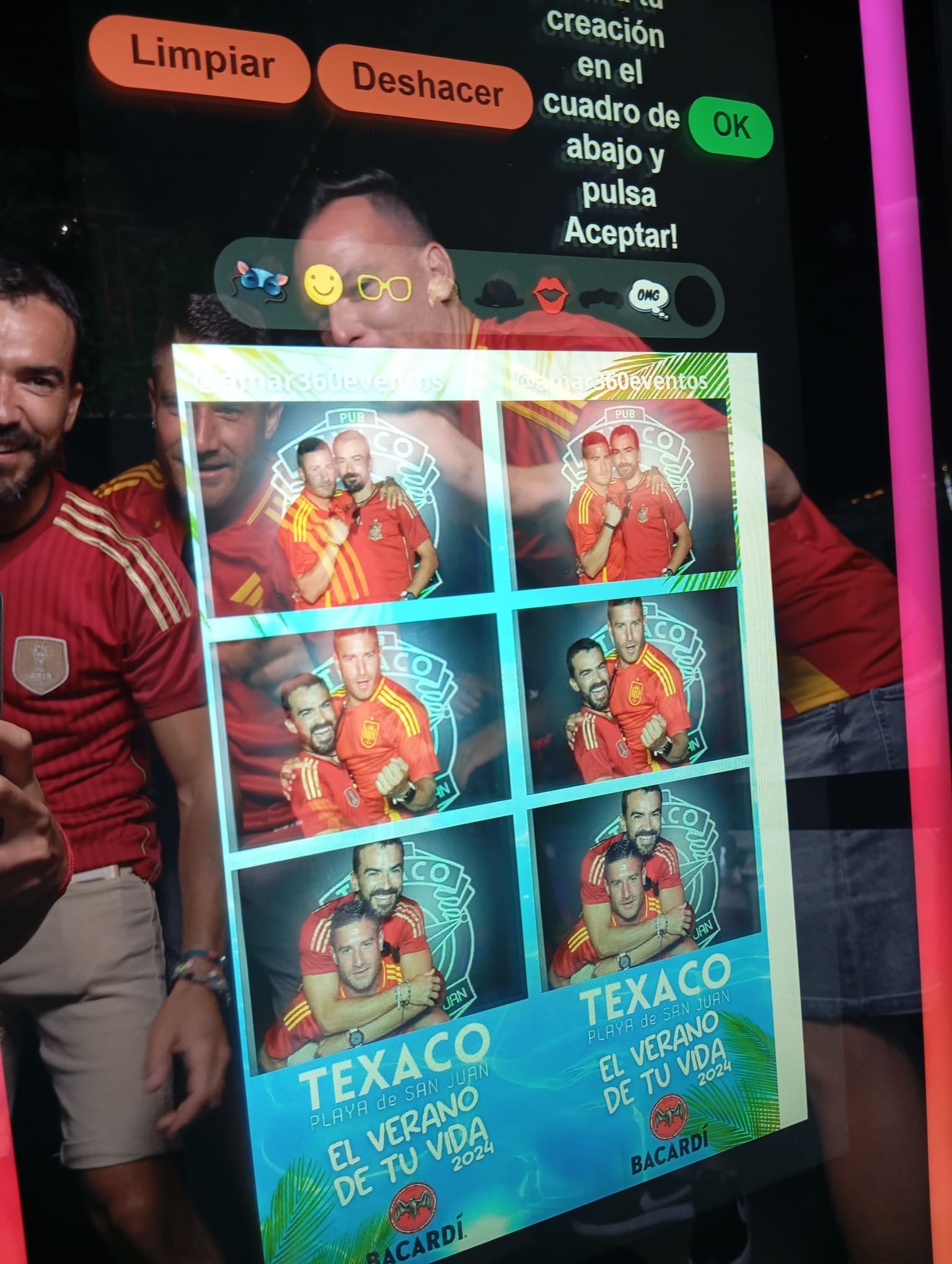 Cuidamos mucho la imagen y la puesta en escena de todo lo que hacemos por eso.. No pienses que es cualquier fotomatón anticuado. Te ofrecemos lo último en fotomatones: un espejo de cristal táctil donde puedes interactuar con la pantalla, añadir emojis, etc. Además tiene el borde con luces de neón que ¡os dejara hipnotizados!