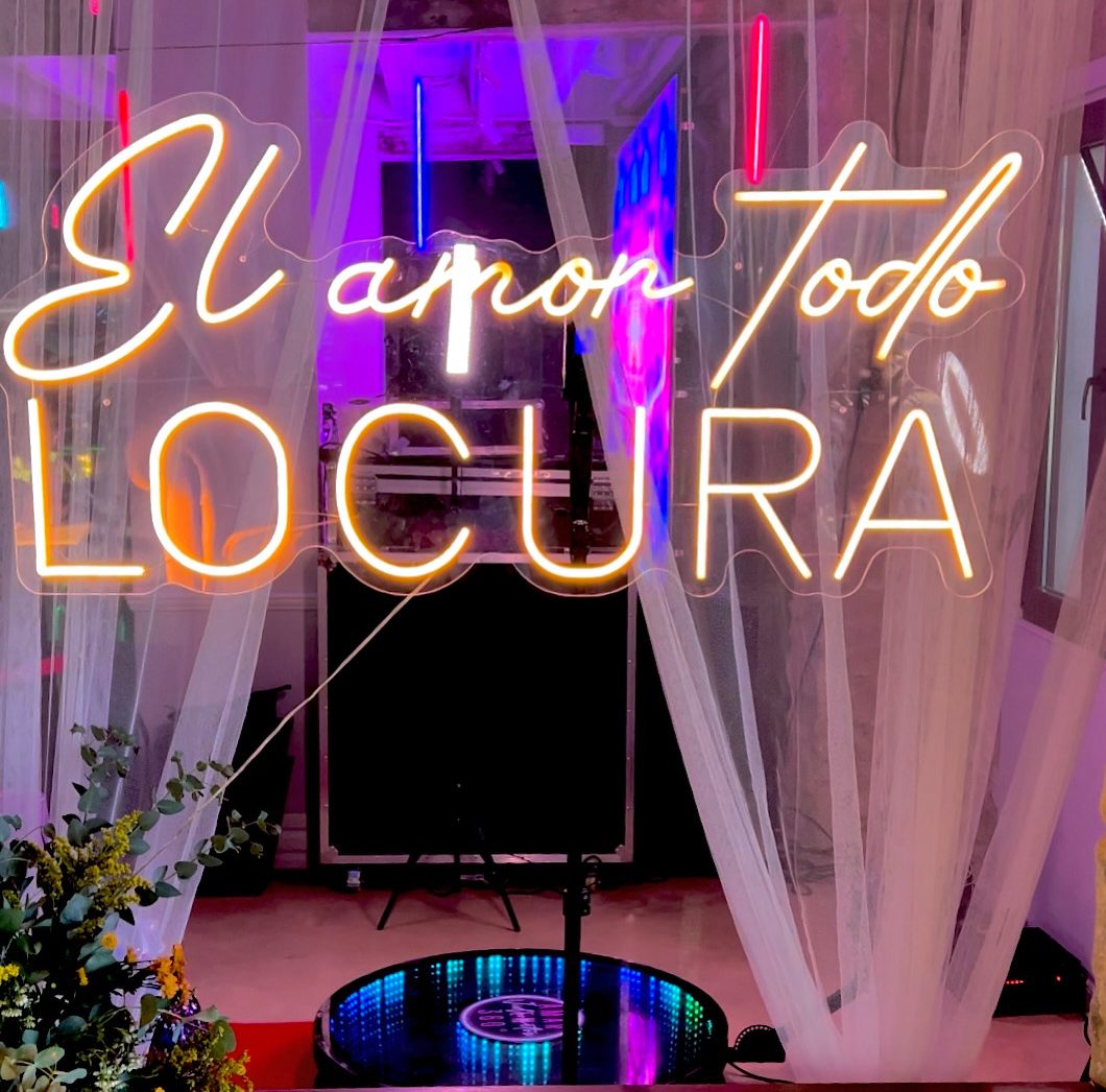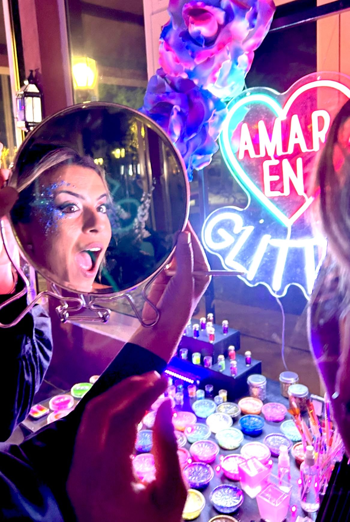 La puesta en escena nos vuelve locas, por eso la mesa iluminada está presidida con un neón decorativo con la frase de” amar en Glitter”, acompañado de unas flores enormes pintadas con neón para que brillen más.